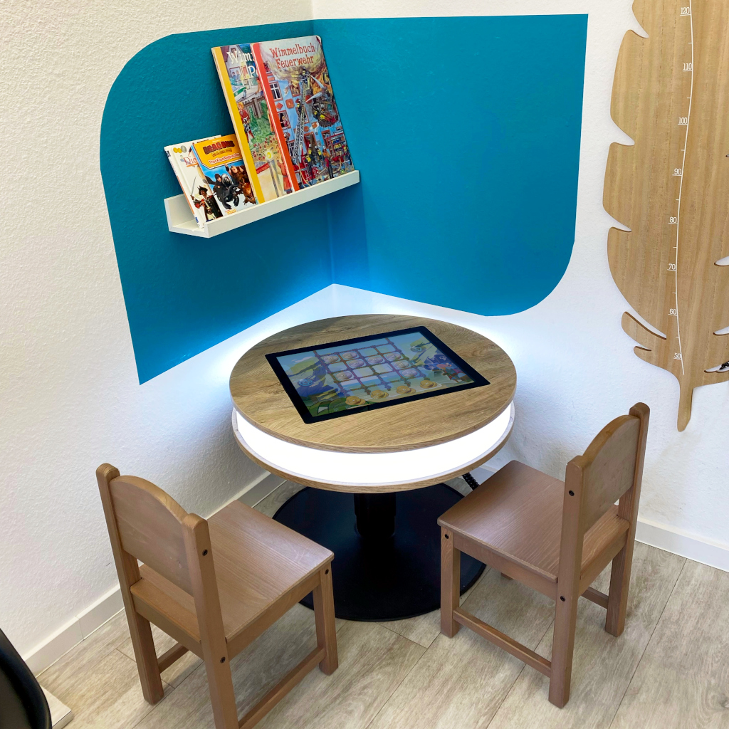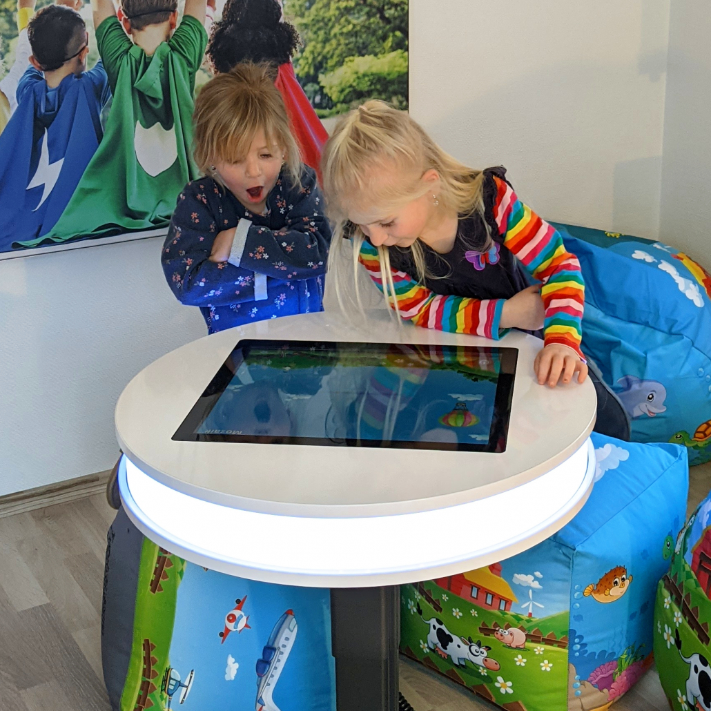 The Magic PlayTable smart is our most compact table solution, with a space-saving diameter of just 65 cm. The large built-in touchscreen is flush with the tabletop, making it easy to clean and protected against liquid spills. In addition, the height of the Magic PlayTable smart can be continuously adjusted between 48 and 84 cm.
